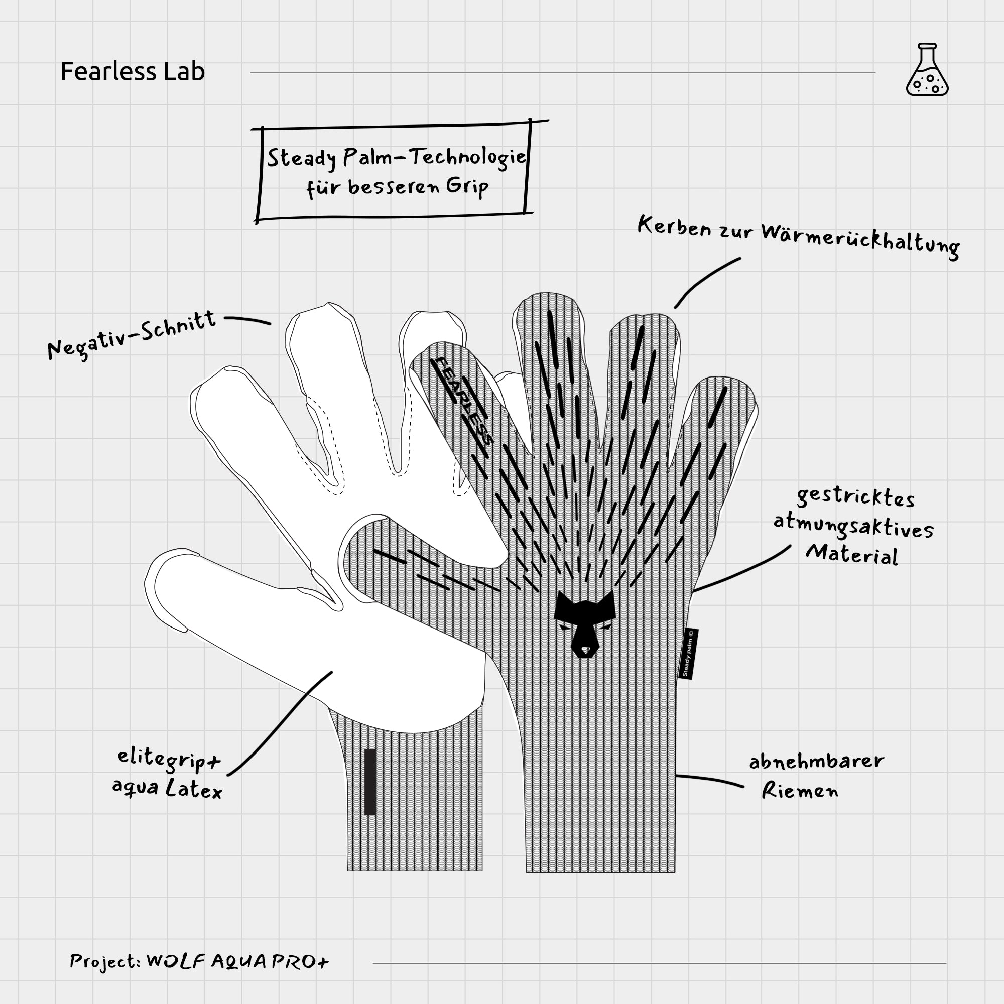 Die  WOLF PRO+ AQUA vereinen mutiges Design mit kompromissloser Performance. Der negative cut und die Elitegrip 4 mm Latex‑Handfläche liefern perfekten Kontakt Finger‑Ball für ein außergewöhnliches Ballgefühl, während der gestrickte, atmungsaktive Handrücken deine Hände auch unter härtesten Bedingungen kühl hält. Temperaturregulierende Einkerbungen und der abnehmbare Handgelenksriemen sorgen für sicheren Sitz vom Training bis zum großen Spiel. Und mit SteadyPalm™ ‑Technologie für konstanten Grip im Inneren setzt der Pro+ Aqua neue Maßstäbe für professionelle Fußballhandschuhe.