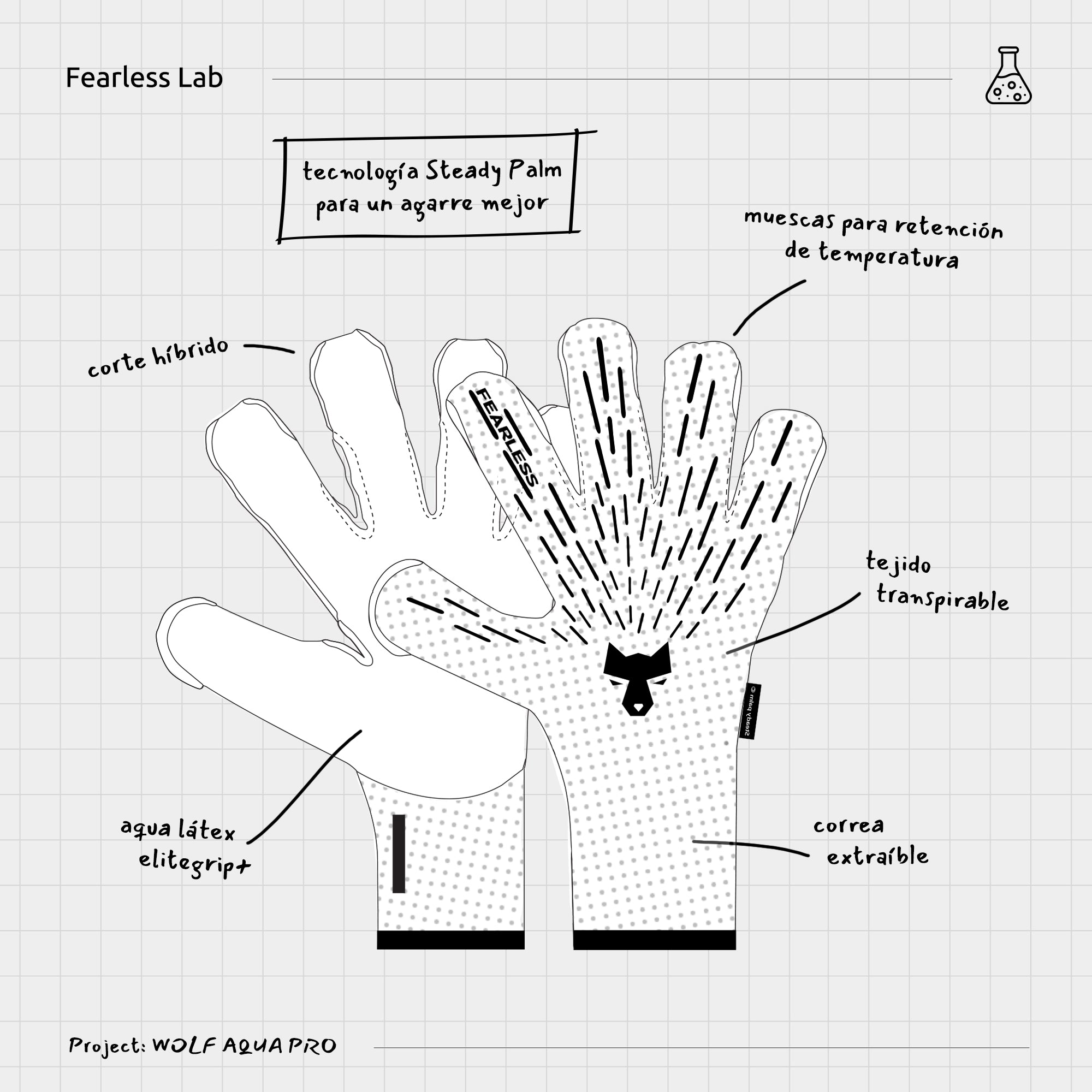 Los guantes de portero WOLF PRO AQUA suben el listón con la tecnología SteadyPalm™ para un agarre ideal dentro del guante. El corte hybrid cut y la palma en látex Elitegrip 4 mm ofrecen un control del balón insuperable, mientras que las ranuras de precisión mantienen la temperatura óptima. Un dorso ligero y transpirable y una correa de muñeca desmontable garantizan un ajuste seguro y una concentración total, ofreciendo protección y control de nivel profesional.