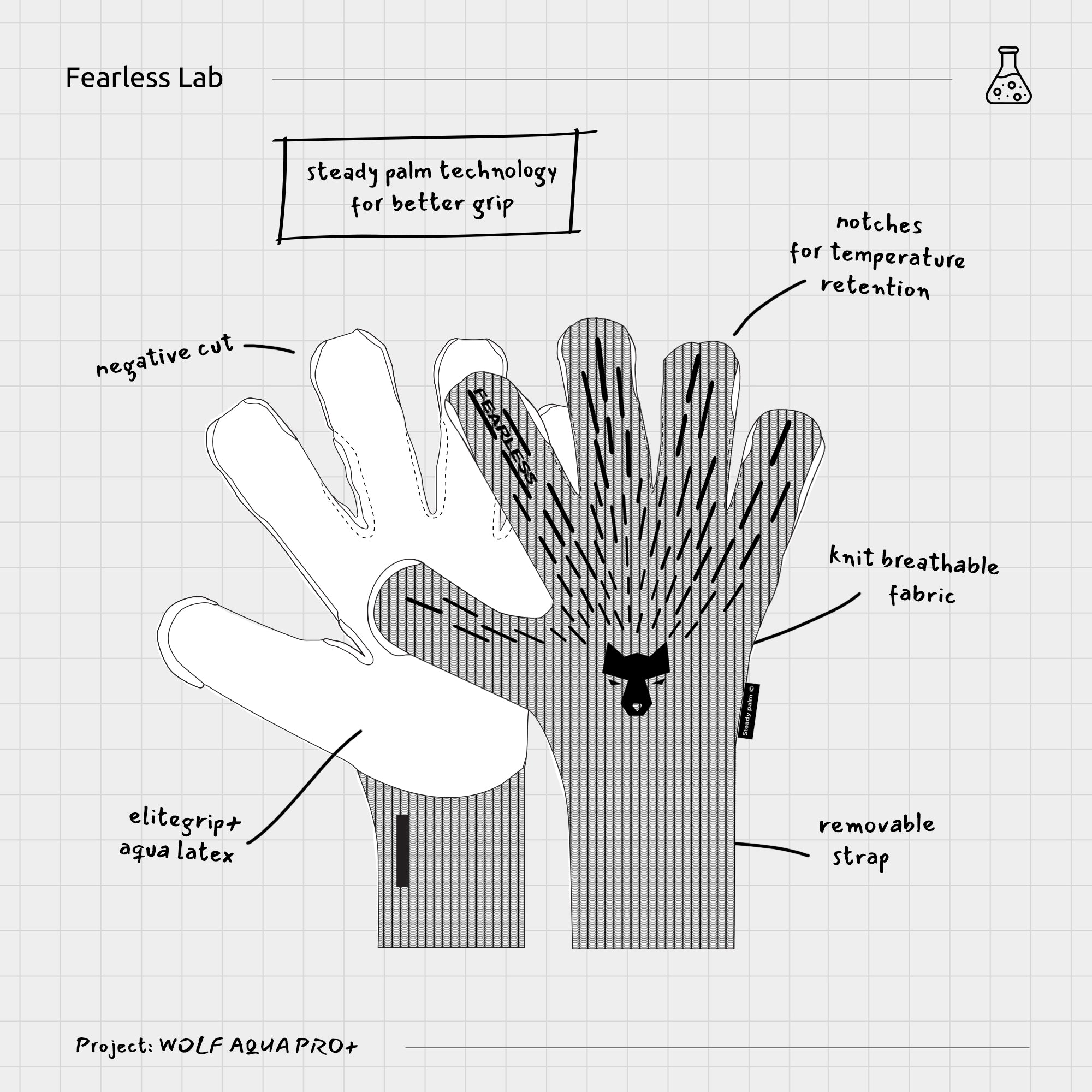 WOLF PRO+ AQUA blends cutting-edge design with uncompromising performance. Its negative cut and Εlitegrip 4mm latex palm deliver fingertip-to-ball contact for exceptional ball feel, while the knitted, breathable backhand keeps your hands cool even in the toughest conditions. Temperature-regulating notches and a detachable wrist strap ensure a secure, customized fit from training sessions to big matches. And with SteadyPalm™ technology locking in consistent grip inside the glove, the Pro+ Aqua sets a new benchmark for professional football gloves.