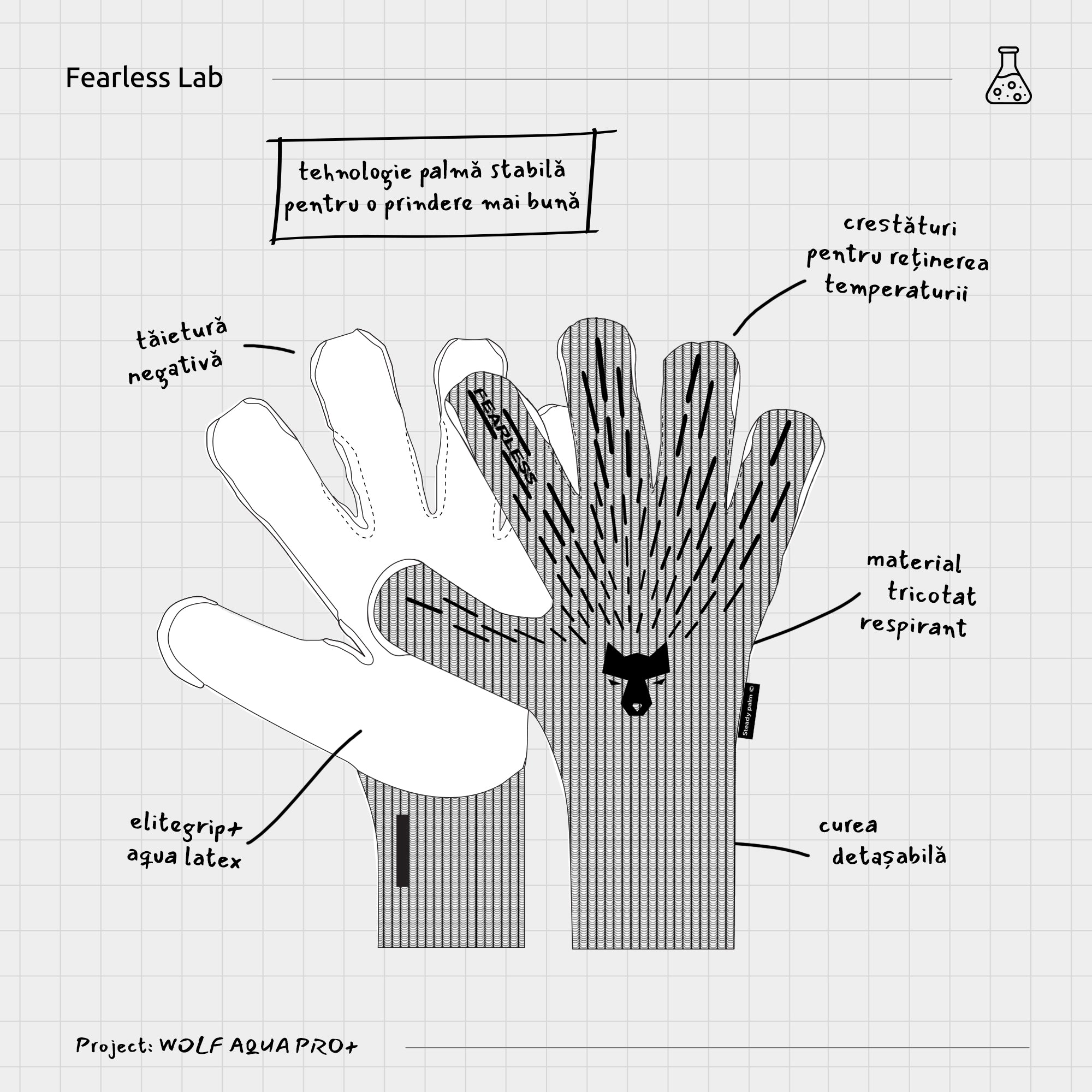 WOLF PRO+ AQUA îmbrățișează design îndrăzneț și performanță fără compromisuri. Negative cut și palma din latex Elitegrip 4 mm oferă contact deget‑minge impecabil pentru o senzație excepțională, în timp ce dosul tricotat și respirabil îți menține mâinile răcoroase chiar și în cele mai grele condiții. Debitările de reglare termică și cureaua detașabilă de la încheietură asigură prindere perfectă de la antrenament până la meciuri importante. Și cu tehnologia SteadyPalm™ care menține grip-ul constant la interior, Pro+ Aqua setează un nou reper pentru mănușile de fotbal profesionale.